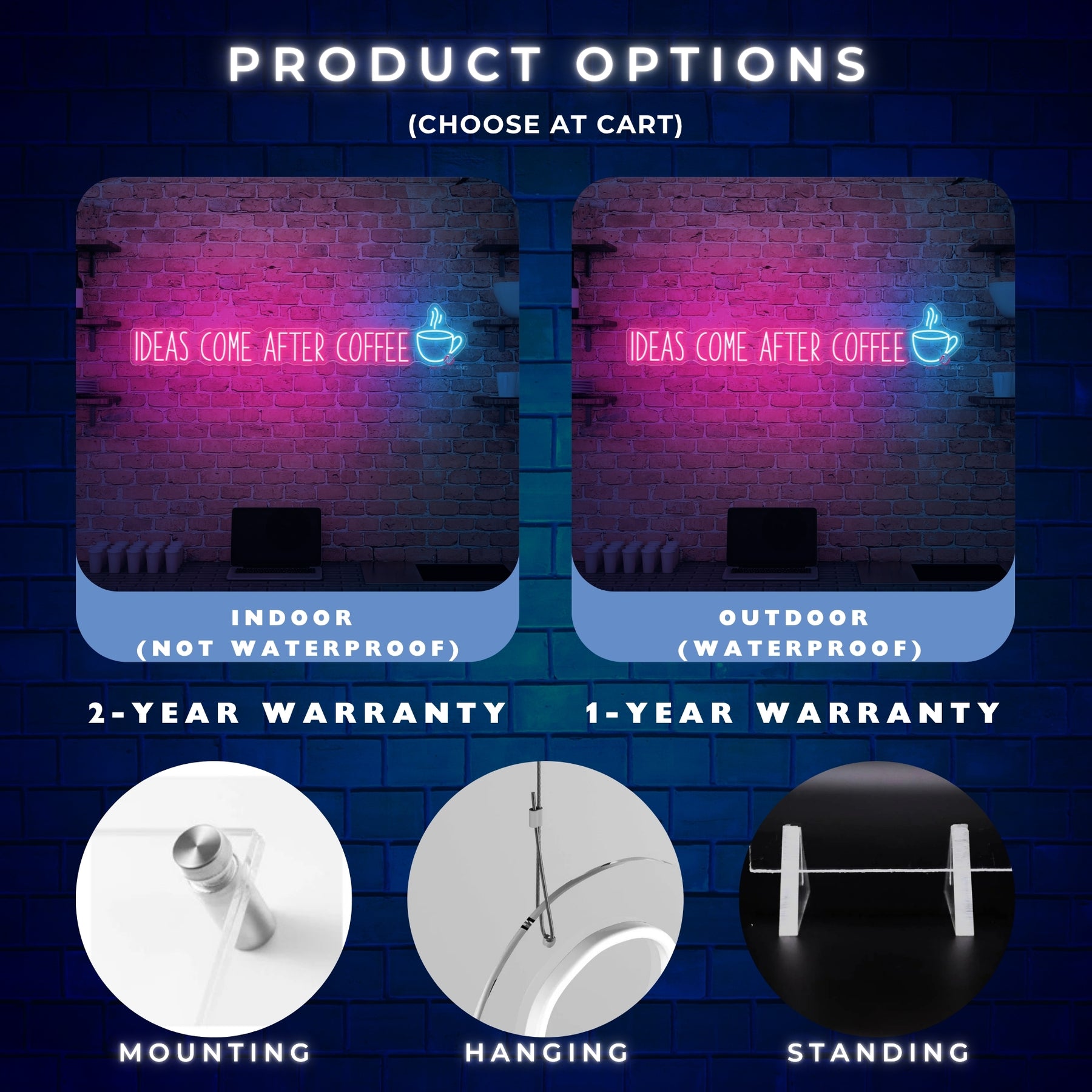 Coffee Neon Sign lights up with inspiration and aroma, featuring the playful phrase “Idea come after coffee” alongside a steaming cup design at the end. Perfect for cafés, offices, studios, or cozy corners, it celebrates the daily ritual that fuels creativity and connection. With its inviting glow and clever message, the Coffee Neon Sign adds warmth, motivation, and charm to any space. Light it up and let the bright ideas brew!