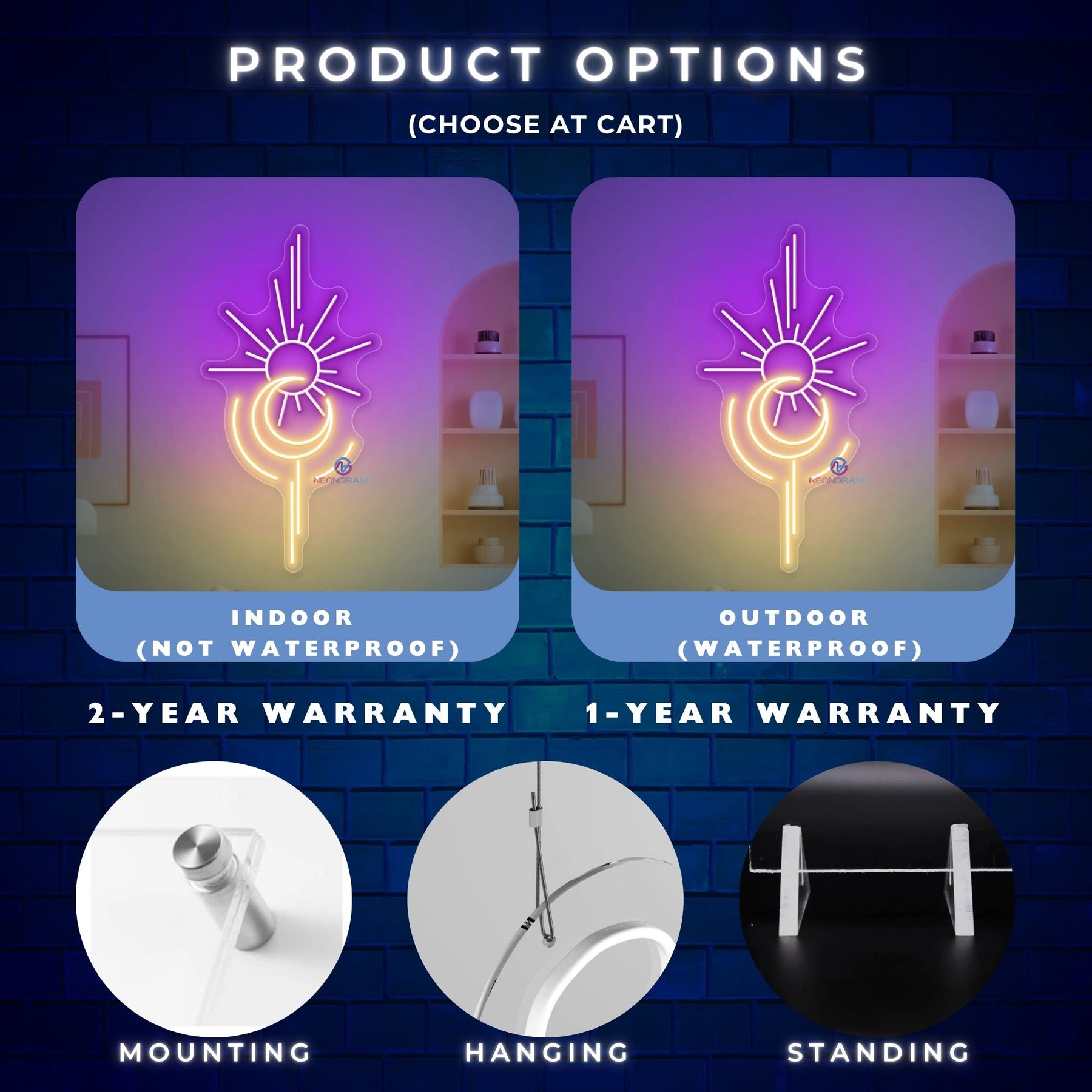 For waterproof option of pre-designed neon sign, you need to pay an extra fee of 89 USD. Please add this fee to cart and pay as product: https://neongrand.com/products/extra-fee-for-waterproof-option